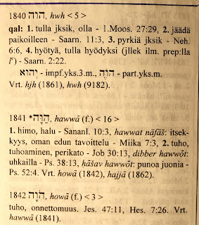 Alla olevassa sanakirjaotteessa näkyy הוה-verbin merkitykset ja esimerkkitekstit kunkin merkityksen kohdalla. Voimme nähdä myös, että itse verbi esiintyy VT:ssa ainoastaan 5 kertaa (mutta sana Jahve/Jehova puolestaa 6828 kertaa).